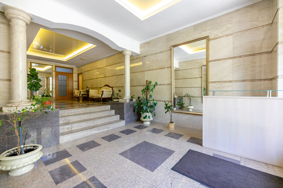 Первый этаж комплекса занимает просторное светлое лобби с охраной. По периметру ведется видеонаблюдение, проезд на территорию дома осуществляется через шлагбаум. Во дворе среди тенистых деревьев и пышных кустарников оборудованы места для отдыха жителей. Предусмотрены подземный паркинг и наземная парковка.